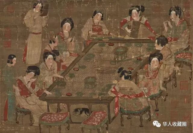 先来看看这幅唐代《唐人宫乐图》,画中可以看到有贵族妇女十人,围坐在一张长方大桌旁进行宴饮。